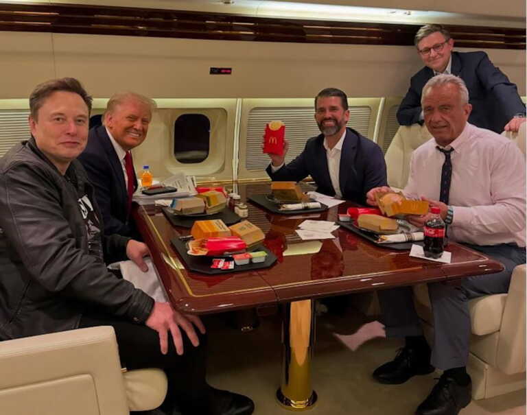 Μερικές ημέρες αφού υποσχέθηκε να «ξαναδώσει στην Αμερική την υγεία της», ο εκλεγμένος πρόεδρος Ντόναλντ Τραμπ, μαζί με αυτόν που προαλείφεται για το αξίωμα του Υπουργείου Υγείας της κυβέρνησής του, τον Ρόμπερτ Φ. Κένεντι τον νεότερο, τον δισεκατομμυριούχο Έλον Μασκ καθώς και τον πρόεδρο της απερχόμενης Βουλής των Αντιπροσώπων, τον Μάικ Τζόνσον, φωτογραφήθηκαν να καταβροχθίζουν χάμπουργκερ και τηγανητές πατάτες της αλυσίδας McDonald’s.