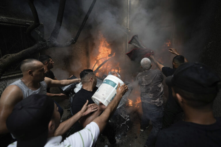 Δημοσιογράφος του Γαλλικού Πρακτορείου είδε στην Τζενίν μέλη της πολιτικής προστασίας να σβήνουν ελαστικά αυτοκινήτων που είχαν πυρποληθεί σε δρόμο κατά τη διάρκεια των επεισοδίων.