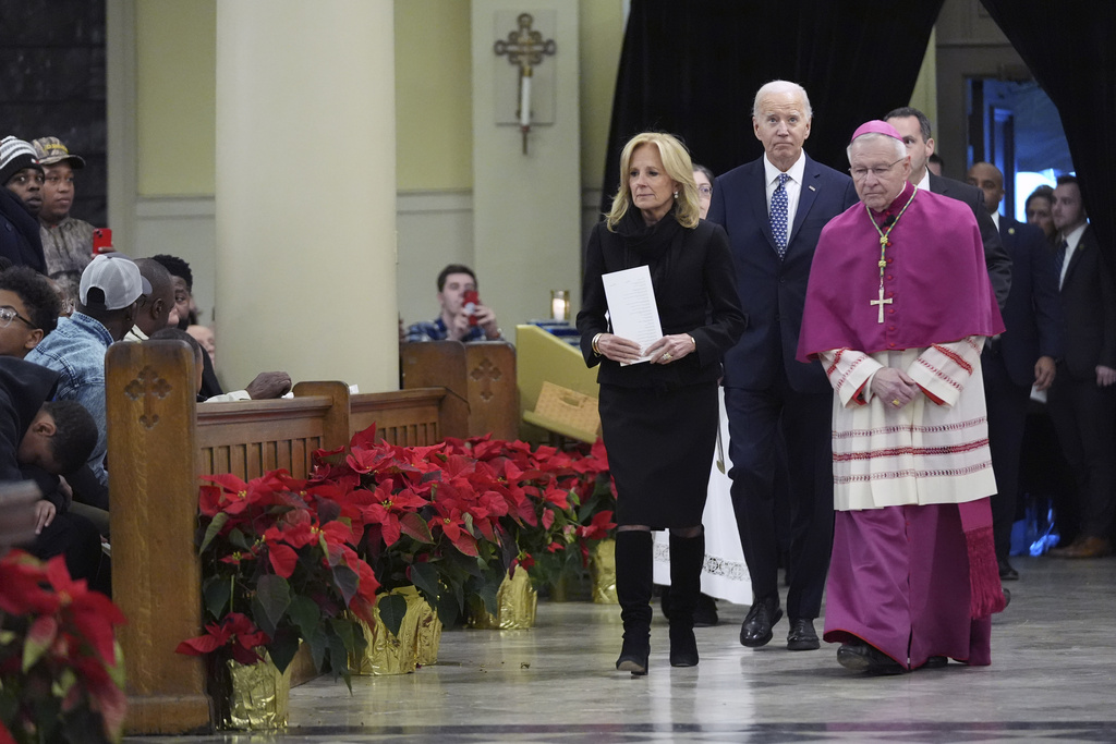 Η Τζιλ Μπάιντεν άφησε λουλούδια, κατόπιν παρέμεινε σιωπηλή, με το κεφάλι κατεβασμένο, όπως και ο Τζο Μπάιντεν, προτού ο πρόεδρος κάνει το σταυρό του καθώς έφευγε.