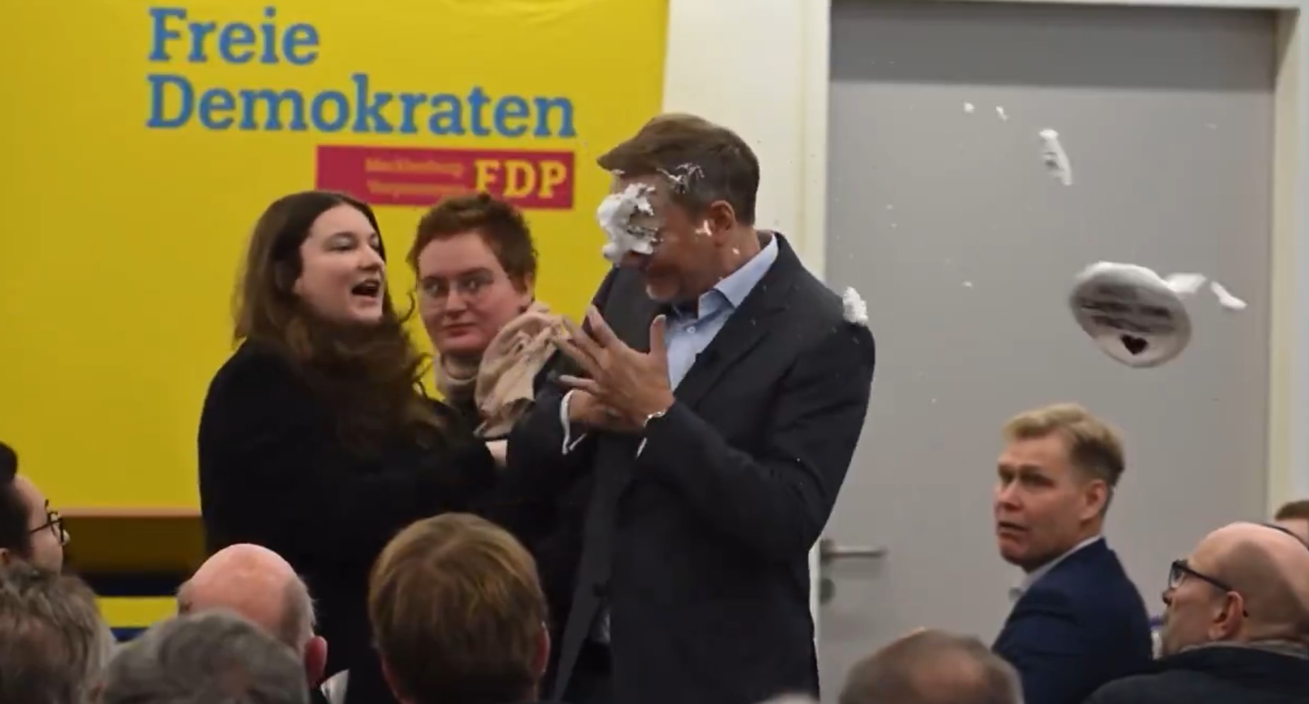 Όπως φαίνεται σε βίντεο που ανακυκλώνεται στο Χ, ο πρώην υπουργός Οικονομικών της Γερμανίας βρίσκεται στο βήμα, όταν ξαφνικά η γυναίκα σηκώνεται, τον πλησιάζει και του πετά με δύναμη το πιάτο με την τούρτα στο πρόσωπο.